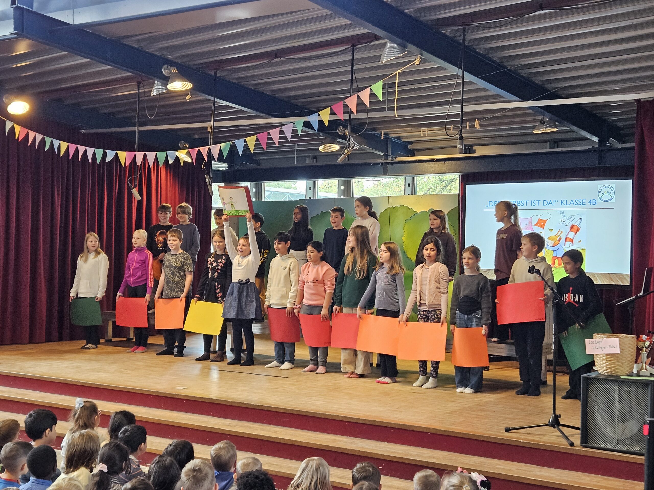 Es gab wieder ein abwechslungsreiches Programm: Die vierten und eine zweite Klasse sorgten für tolle Beiträge. Besonders eindrucksvoll war das Musikstück „Es führt über den Main“, das in ganz unterschiedlichen Musikstilen – von Klassik bis Techno – präsentiert wurde. Auch das Lied „Der Herbst ist da“ stimmte alle auf die Jahreszeit ein. Spannend wurde es bei einem Gedicht über die Zeitform Futur und bei den fantasievollen Geschichten, die die Kinder in dieser Zeitform geschrieben hatten. Der letzte Beitrag handelte von einer ganz besonderen Belohnung: Schokolade!